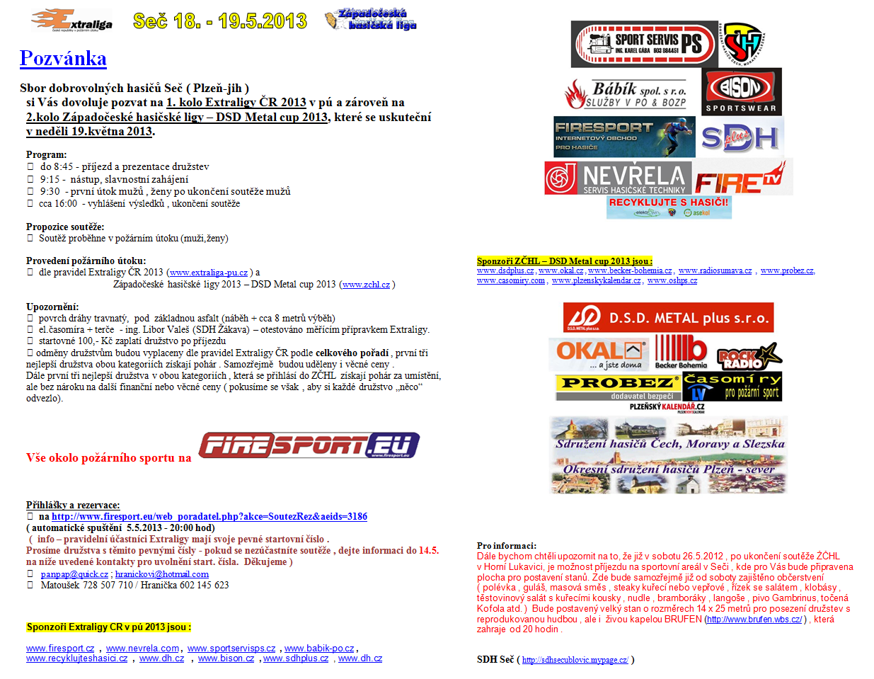 Vydáno dne 28. 04. 2013 (4233 x přečteno)Sbor dobrovolných hasičů Seč ( Plzeň-jih ) si Vás dovoluje pozvat na 1. kolo Extraligy ČR 2013 v pú a zároveň na 2.kolo Západočeské hasičské ligy – DSD Metal cup 2013, které se uskuteční v neděli 19.května 2013.